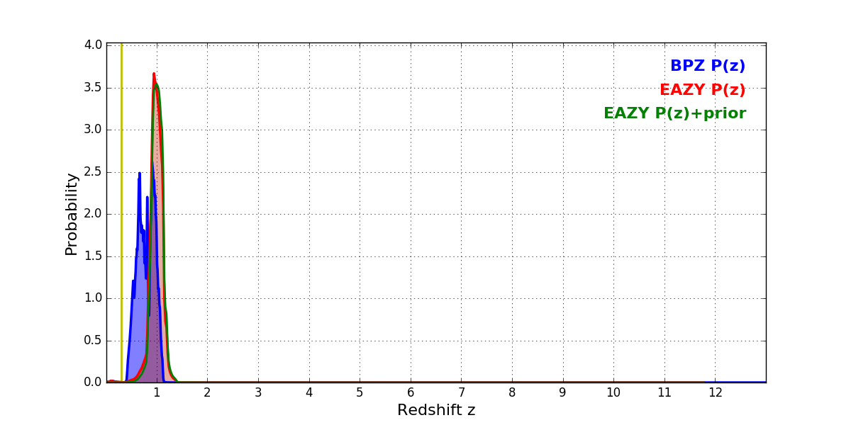 In P(z) plots: Yellow lines mark the cluster redshift z = 0.300,