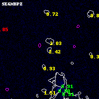 Object #17827 x,y = (2610, 4466) RA, Dec = (01:03:03.120, -49:14:53.88) = (15.76300, -49.24830) BPZ = 2.417 [0.290--3.178] type = 9.60 (SB3_B10 - SB2_B10) chisq2 = 0.40 ODDS = 0.15 z_cluster = 0.870