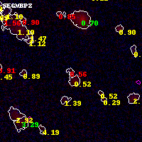 Object #7850 x,y = (4102, 3357) RA, Dec = (01:02:53.976, -49:16:00.12) = (15.72490, -49.26670) BPZ = 0.565 [0.138--3.936] type = 8.80 (SB2_B10 - SB1_B10) chisq2 = 1.38 ODDS = 0.11 z_cluster = 0.870