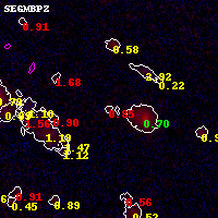 Object #8100 x,y = (4086, 3438) RA, Dec = (01:02:54.072, -49:15:55.44) = (15.72530, -49.26540) BPZ = 0.852 [0.260--4.660] type = 8.20 (SB1_B10 - SB2_B10) chisq2 = 1.61 ODDS = 0.27 z_cluster = 0.870