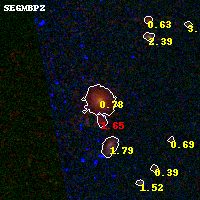 Object #1518 x,y = (2142, 3424) RA, Dec = (01:03:06.000, -49:15:56.16) = (15.77500, -49.26560) BPZ = 0.781 [0.675--0.823] type = 5.40 (ES0_B10 - Sbc_B10) chisq2 = 0.10 ODDS = 0.89 z_cluster = 0.870