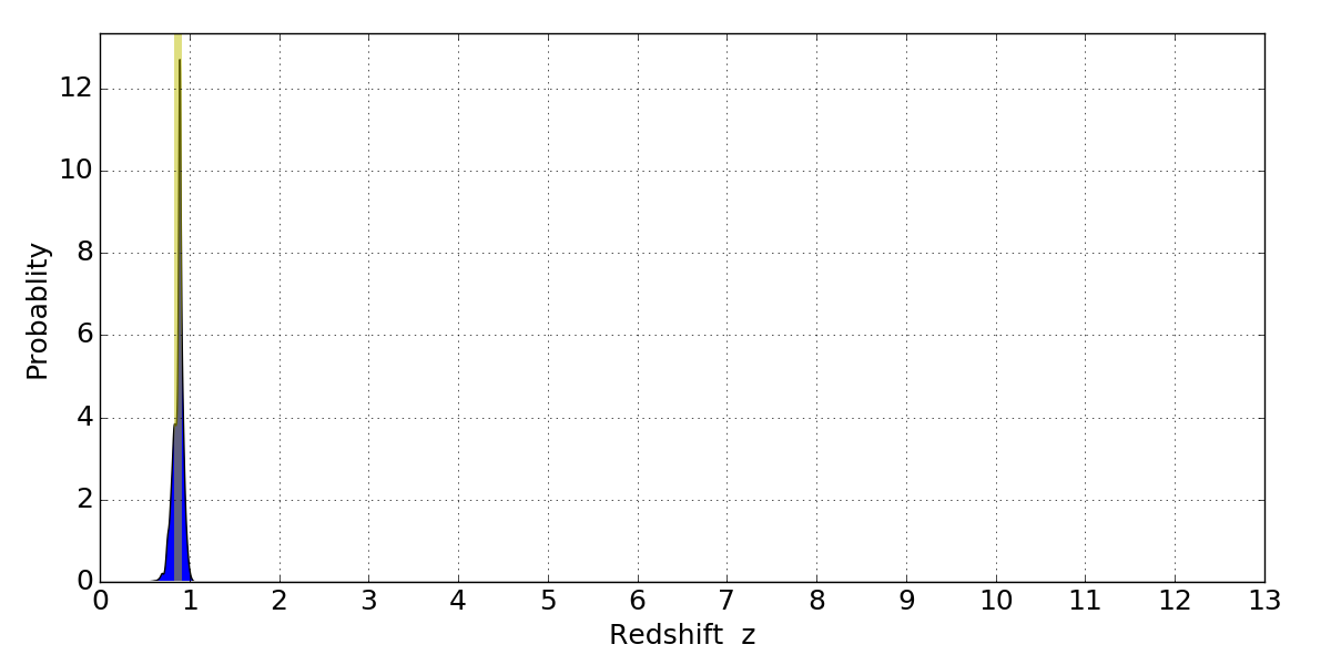 In P(z) plots: Yellow lines mark the cluster redshift z = 0.870,