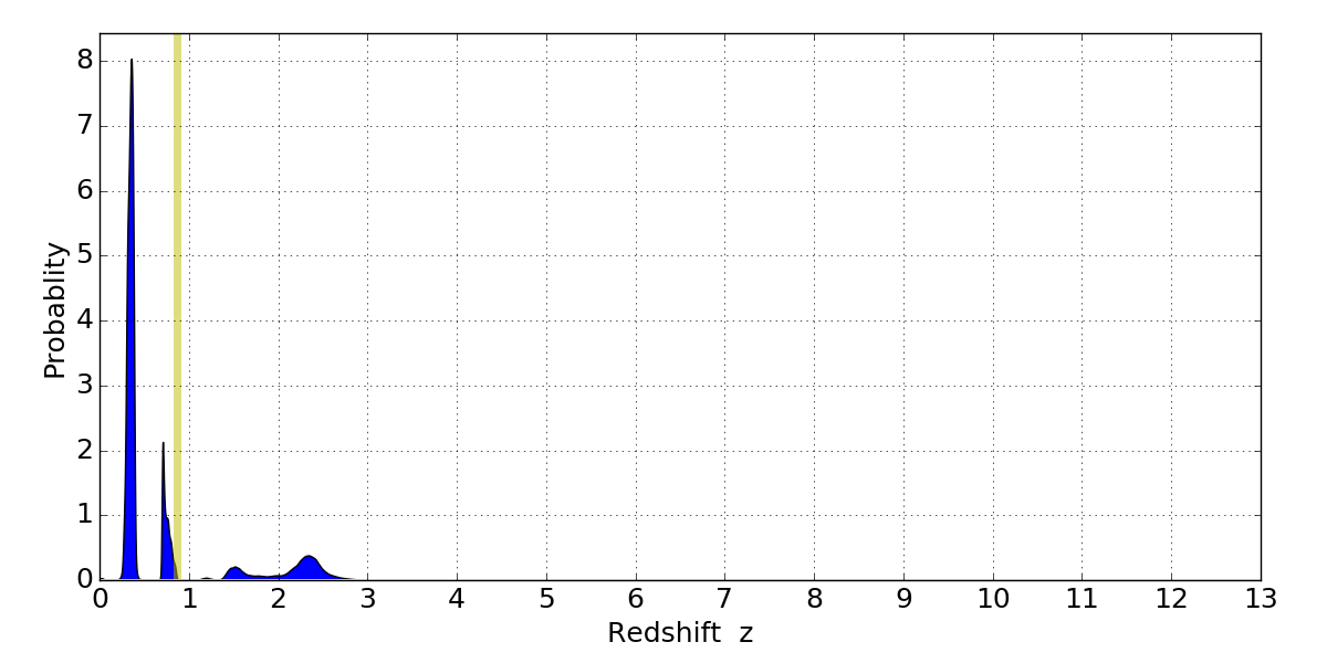 In P(z) plots: Yellow lines mark the cluster redshift z = 0.870,