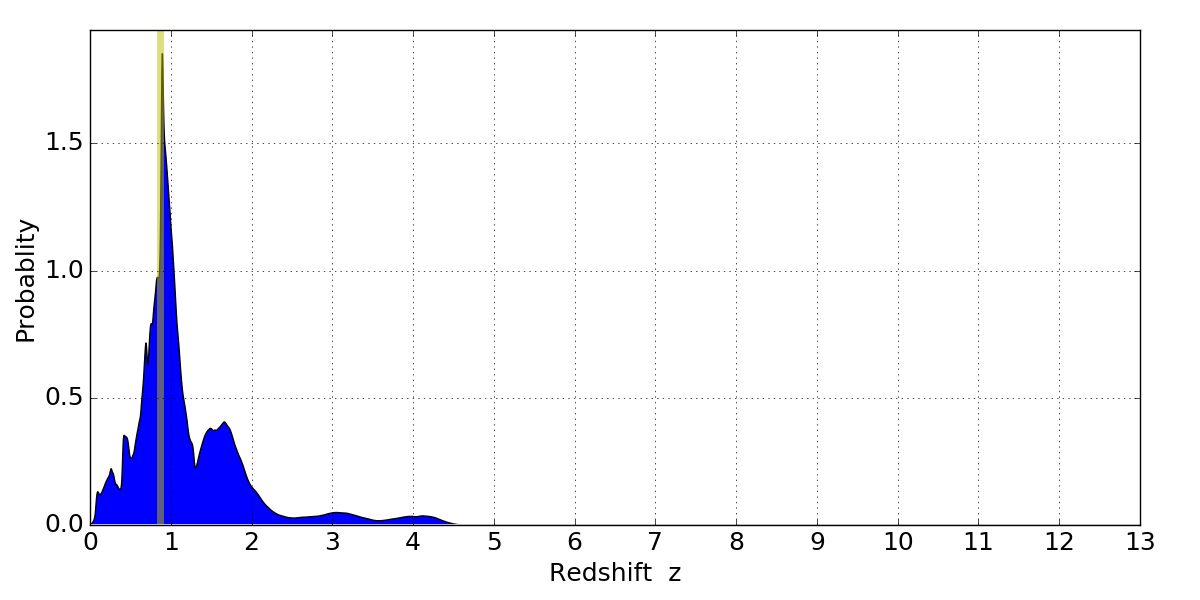 In P(z) plots: Yellow lines mark the cluster redshift z = 0.870,