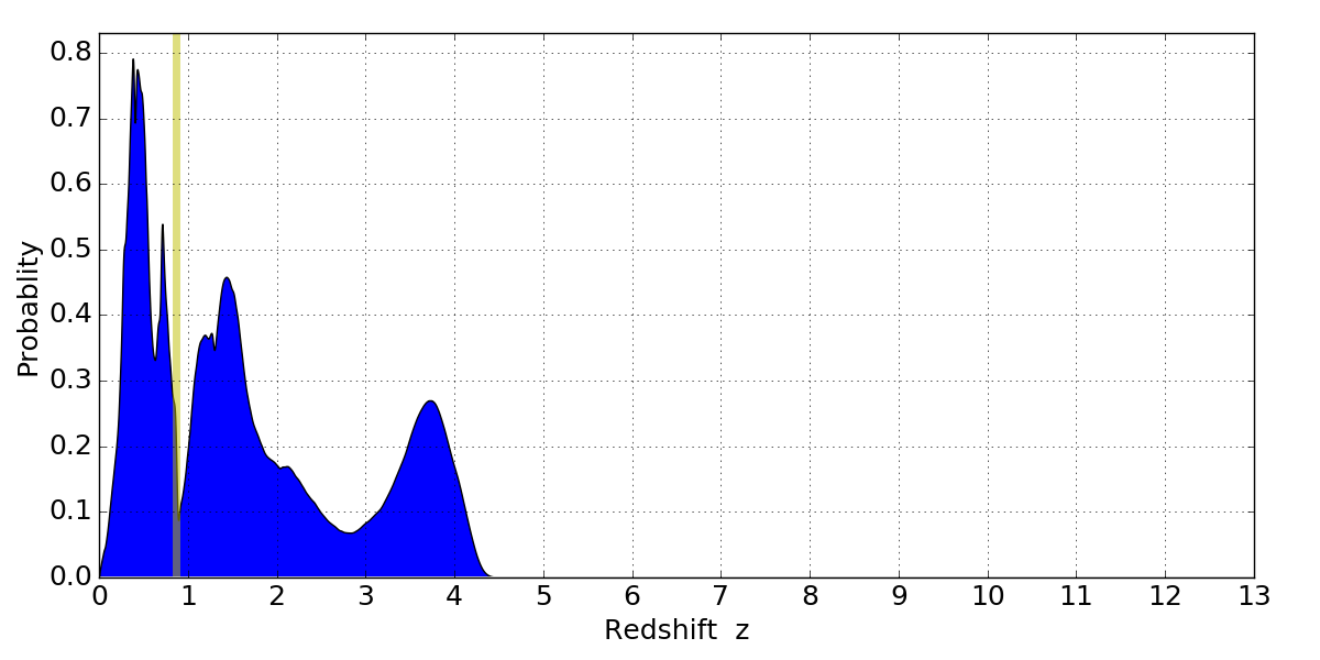 In P(z) plots: Yellow lines mark the cluster redshift z = 0.870,