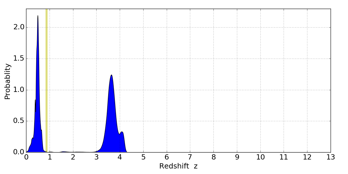 In P(z) plots: Yellow lines mark the cluster redshift z = 0.870,