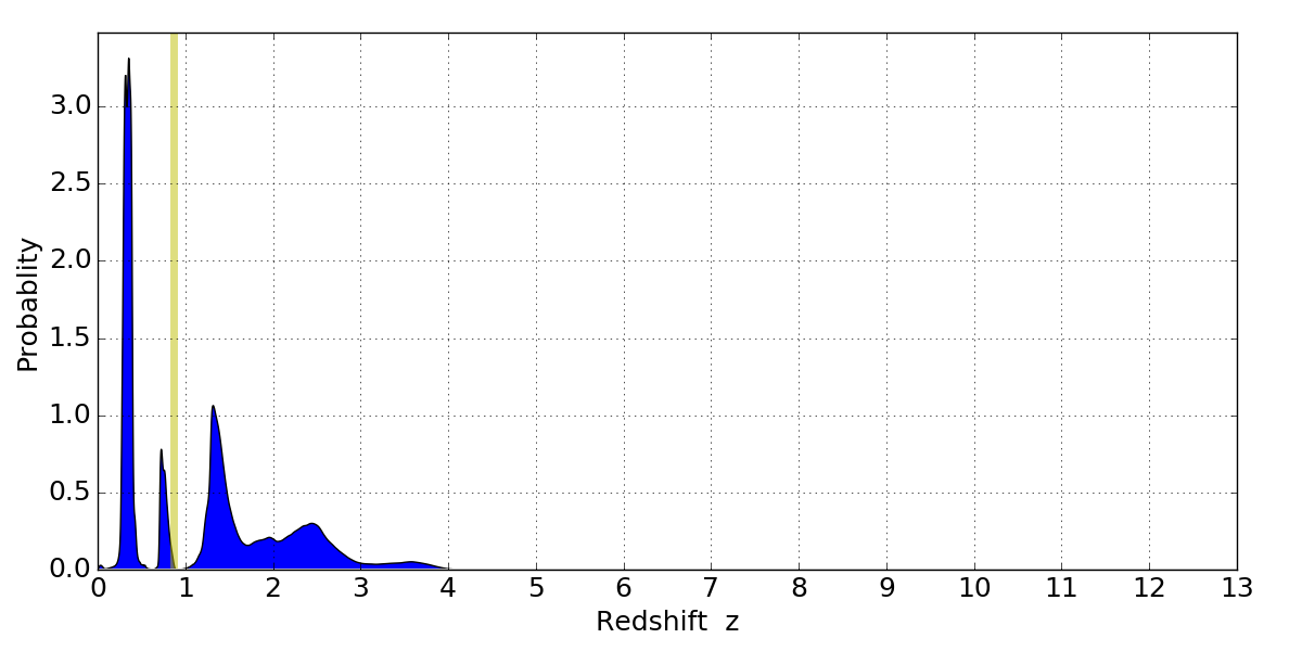 In P(z) plots: Yellow lines mark the cluster redshift z = 0.870,