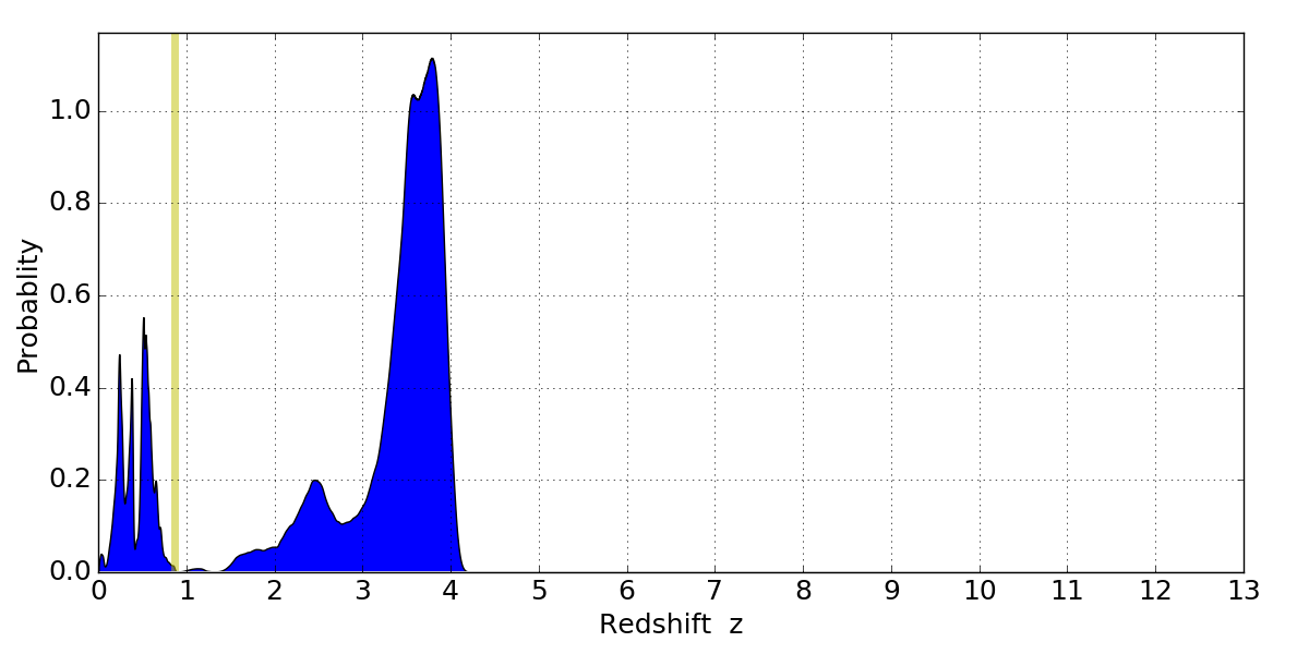 In P(z) plots: Yellow lines mark the cluster redshift z = 0.870,