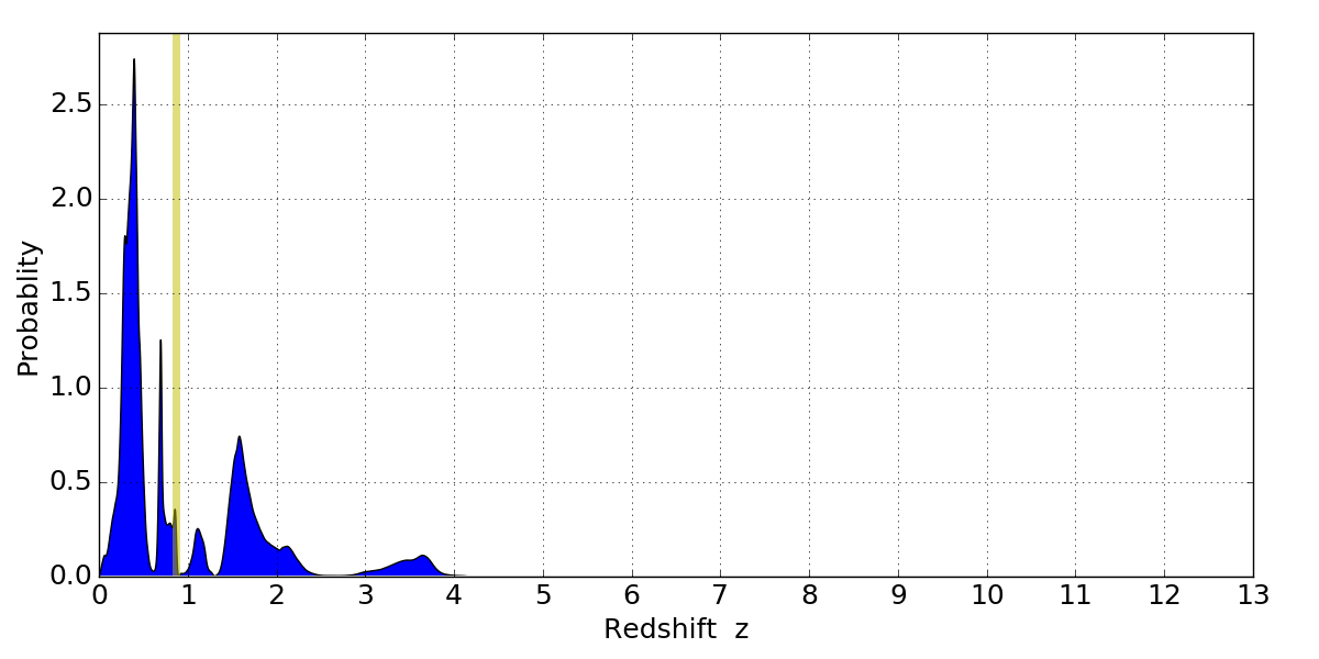 In P(z) plots: Yellow lines mark the cluster redshift z = 0.870,
