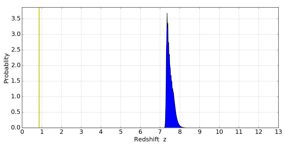 In P(z) plots: Yellow lines mark the cluster redshift z = 0.870,