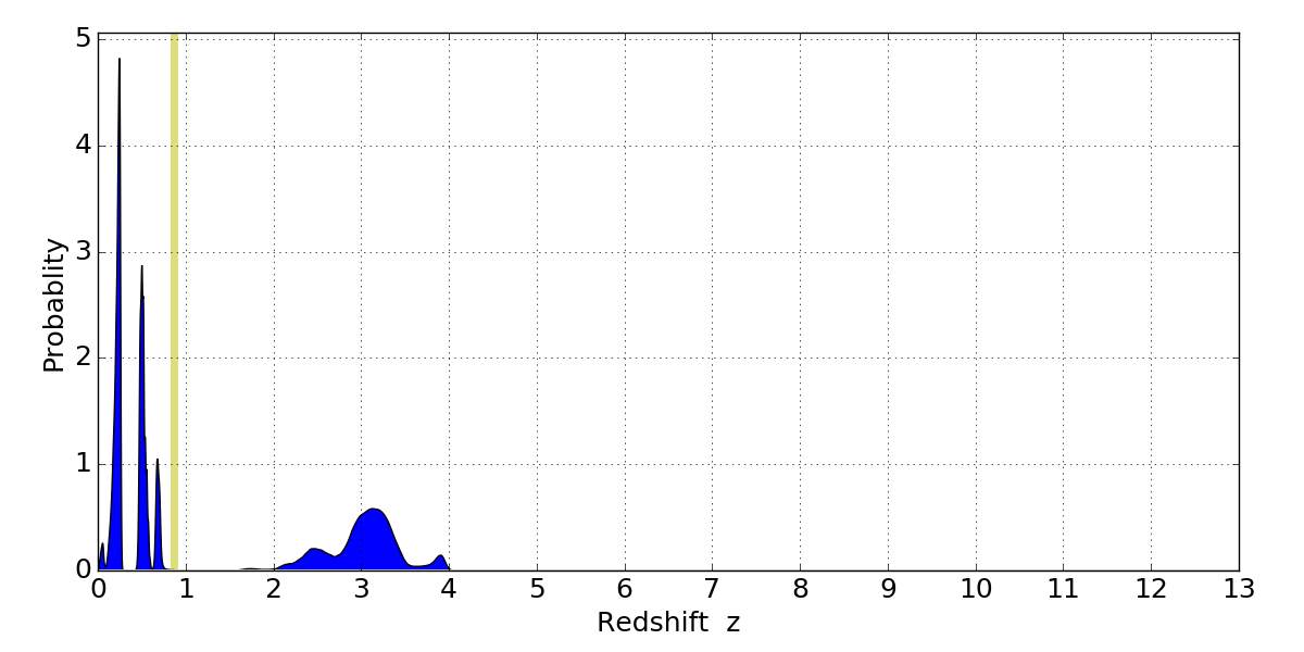 In P(z) plots: Yellow lines mark the cluster redshift z = 0.870,