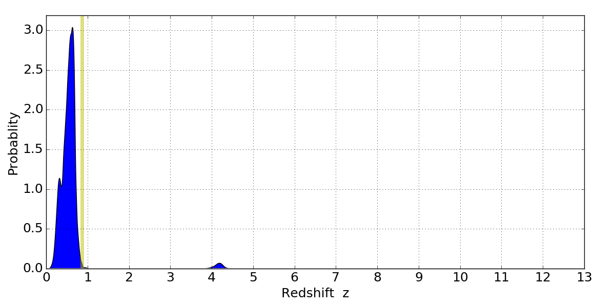 In P(z) plots: Yellow lines mark the cluster redshift z = 0.870,