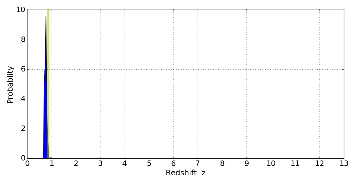 In P(z) plots: Yellow lines mark the cluster redshift z = 0.870,