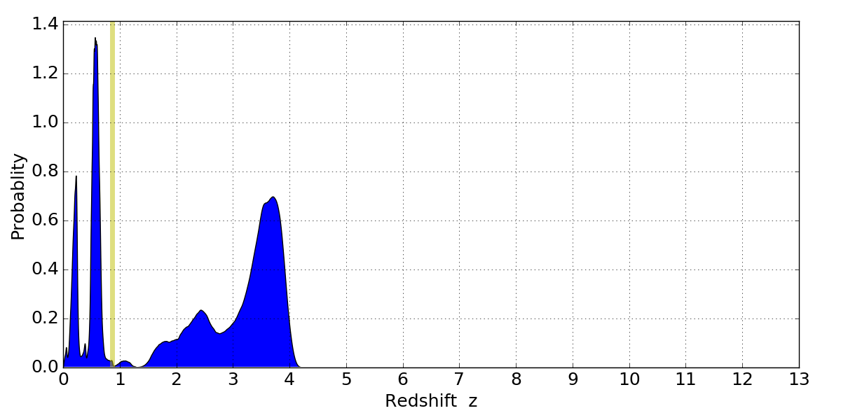 In P(z) plots: Yellow lines mark the cluster redshift z = 0.870,