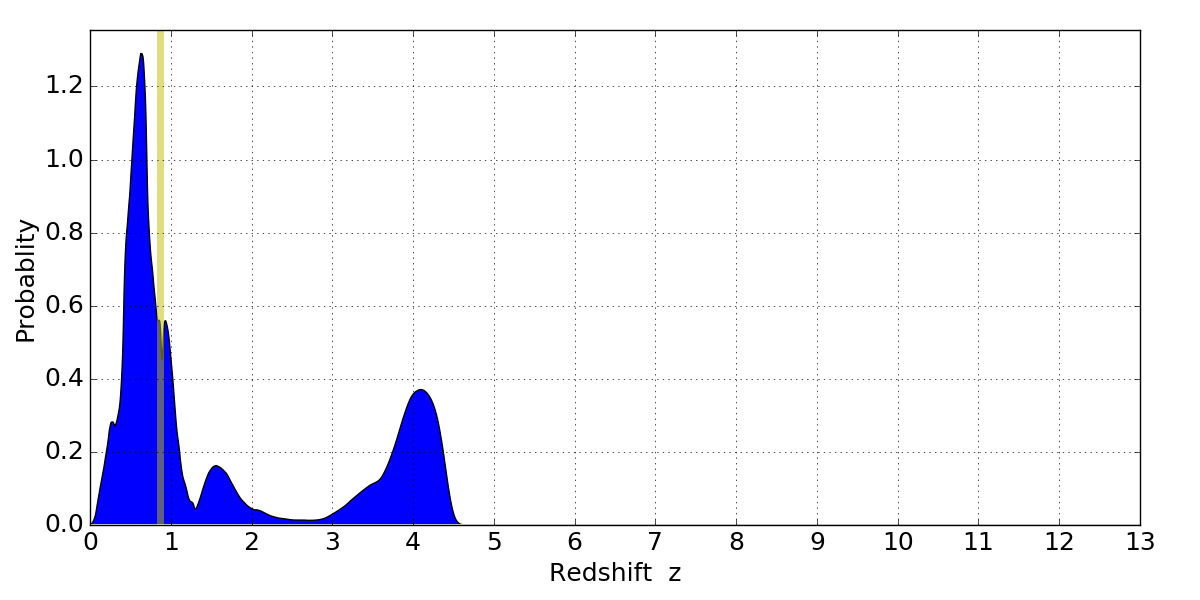 In P(z) plots: Yellow lines mark the cluster redshift z = 0.870,