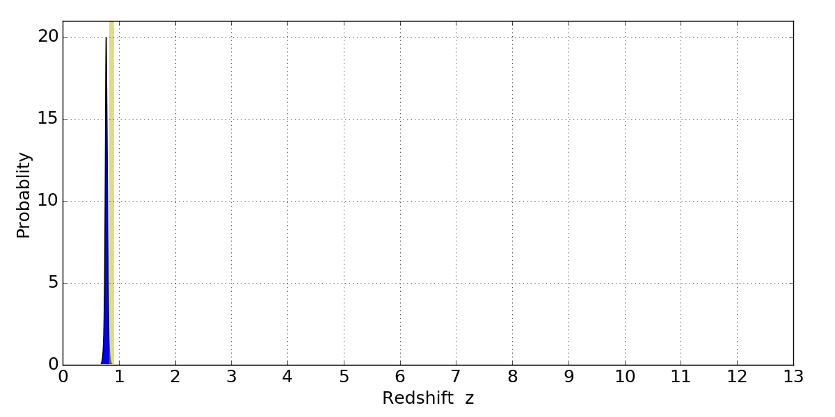In P(z) plots: Yellow lines mark the cluster redshift z = 0.870,