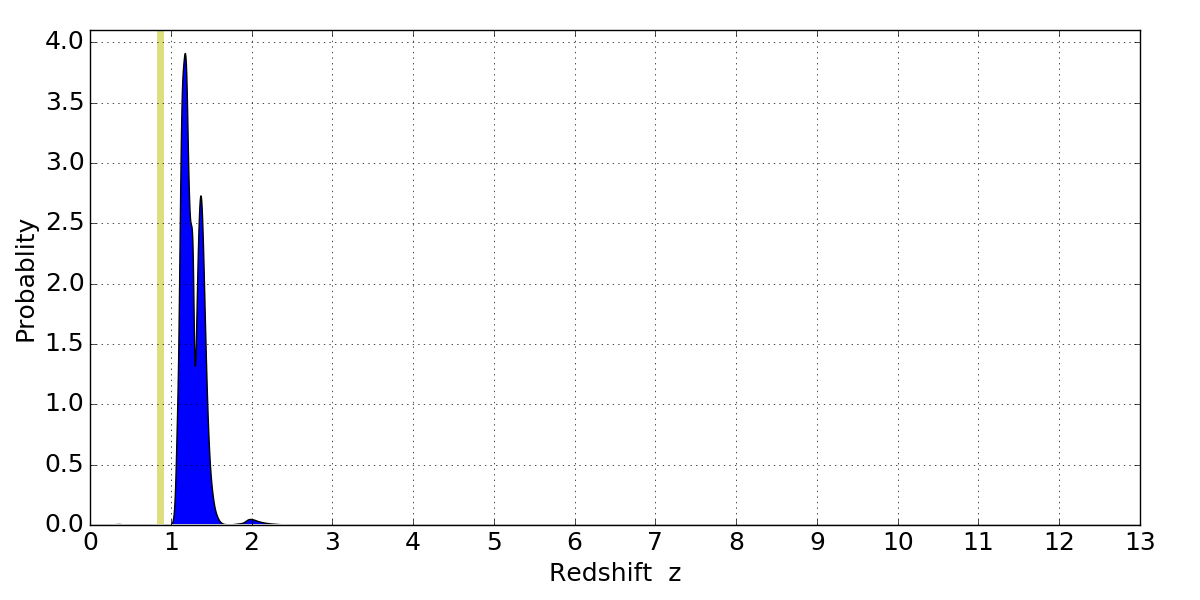 In P(z) plots: Yellow lines mark the cluster redshift z = 0.870,