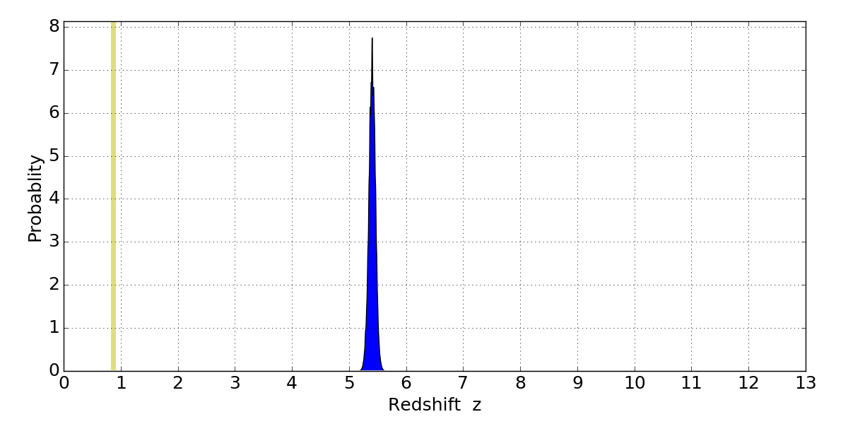 In P(z) plots: Yellow lines mark the cluster redshift z = 0.870,