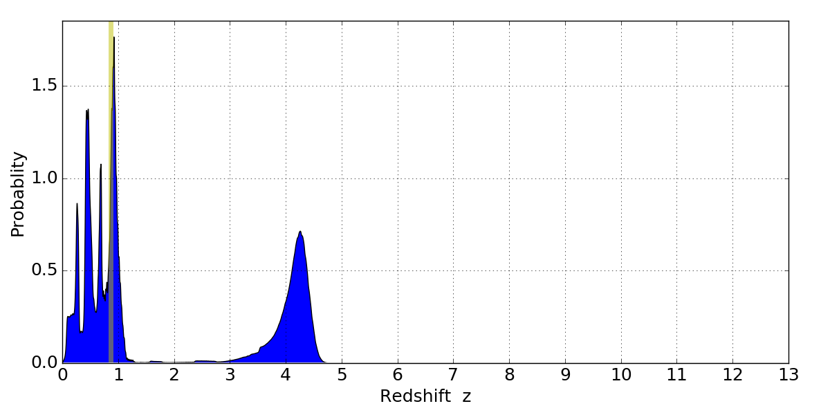 In P(z) plots: Yellow lines mark the cluster redshift z = 0.870,