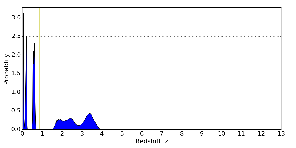 In P(z) plots: Yellow lines mark the cluster redshift z = 0.870,