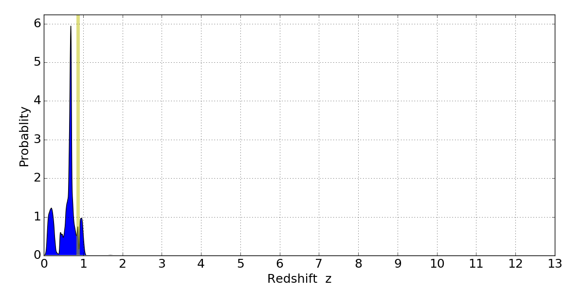 In P(z) plots: Yellow lines mark the cluster redshift z = 0.870,