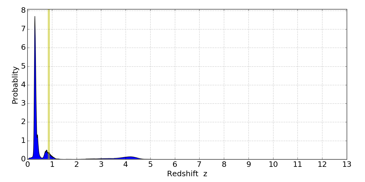 In P(z) plots: Yellow lines mark the cluster redshift z = 0.870,