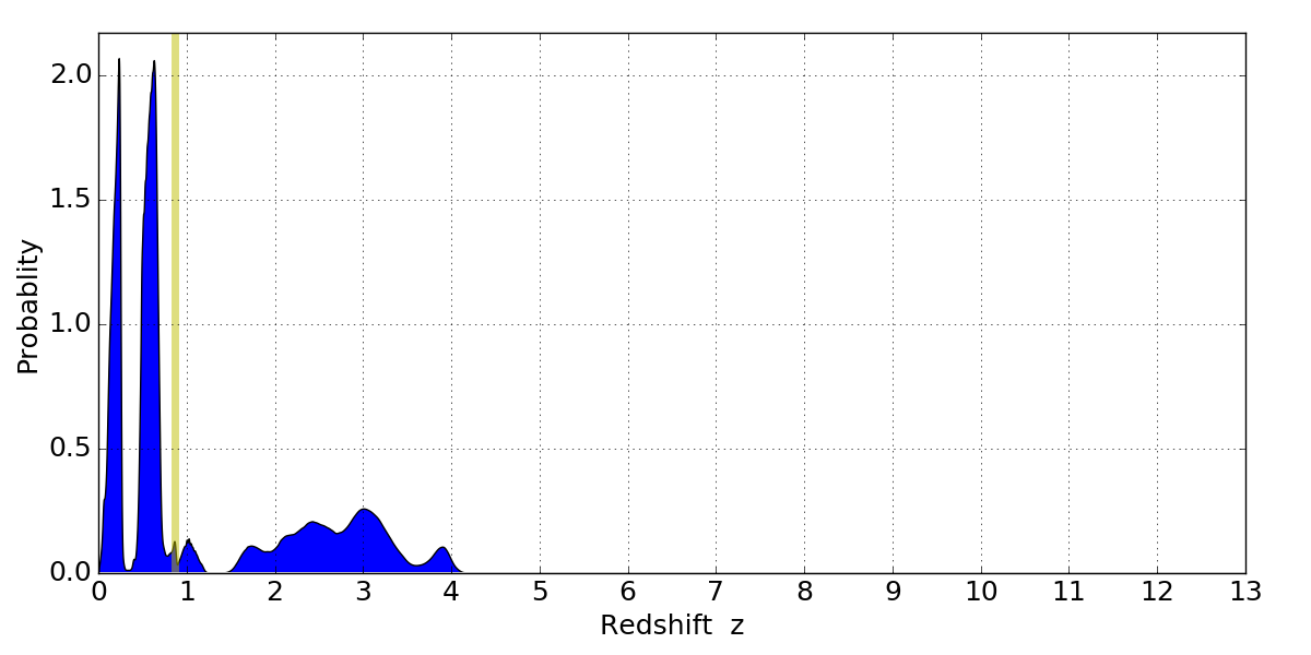 In P(z) plots: Yellow lines mark the cluster redshift z = 0.870,