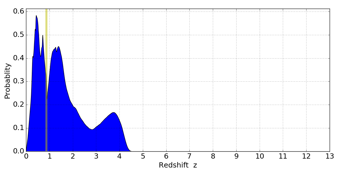 In P(z) plots: Yellow lines mark the cluster redshift z = 0.870,