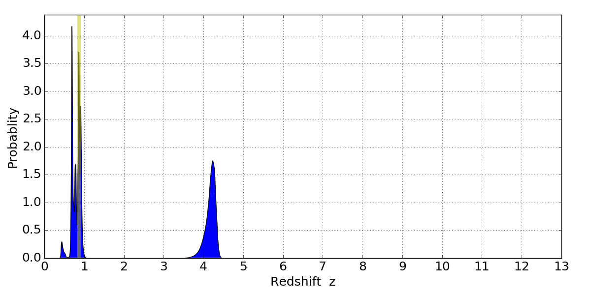 In P(z) plots: Yellow lines mark the cluster redshift z = 0.870,