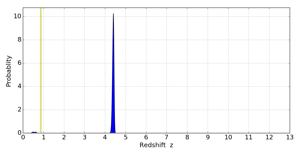 In P(z) plots: Yellow lines mark the cluster redshift z = 0.870,