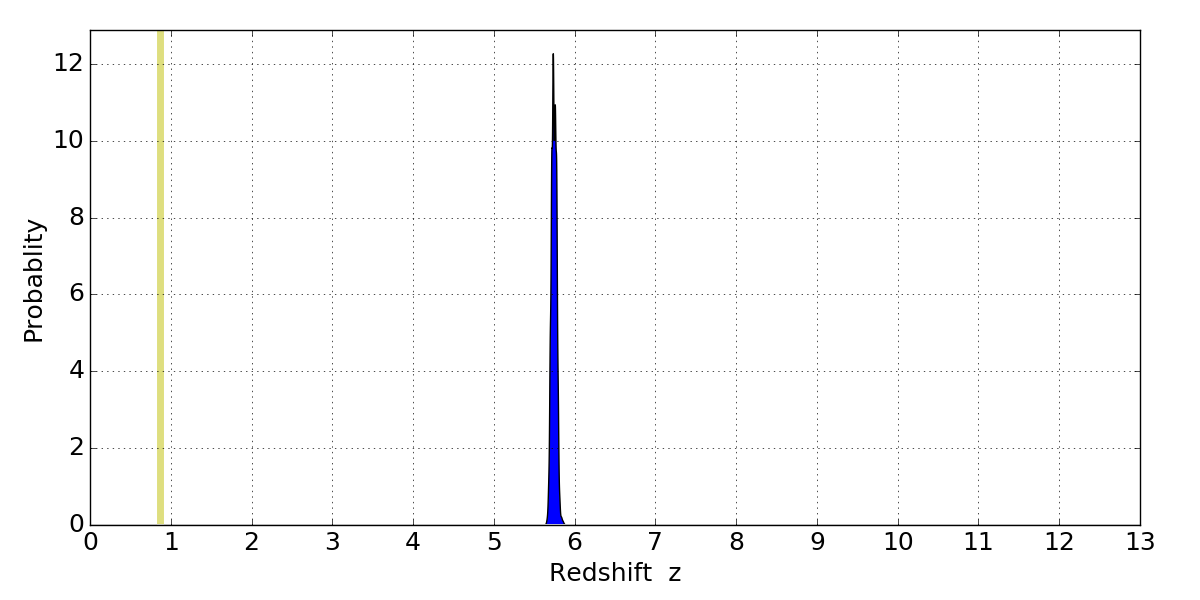 In P(z) plots: Yellow lines mark the cluster redshift z = 0.870,