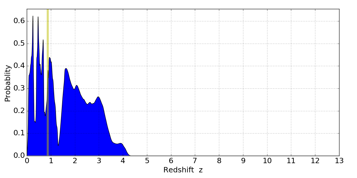 In P(z) plots: Yellow lines mark the cluster redshift z = 0.870,