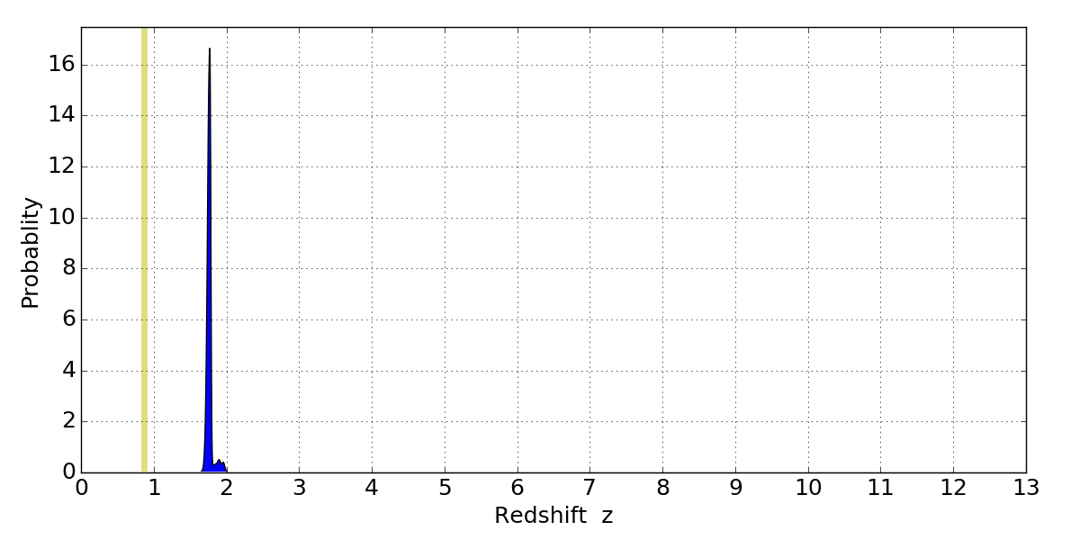 In P(z) plots: Yellow lines mark the cluster redshift z = 0.870,