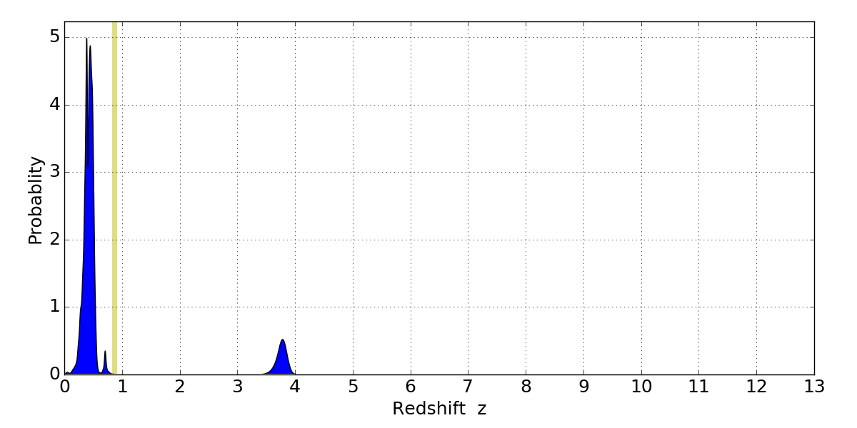 In P(z) plots: Yellow lines mark the cluster redshift z = 0.870,