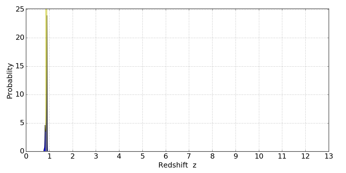 In P(z) plots: Yellow lines mark the cluster redshift z = 0.870,