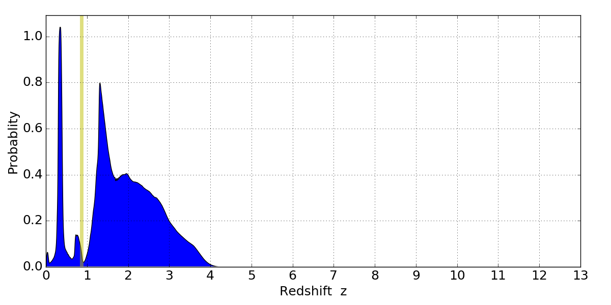 In P(z) plots: Yellow lines mark the cluster redshift z = 0.870,