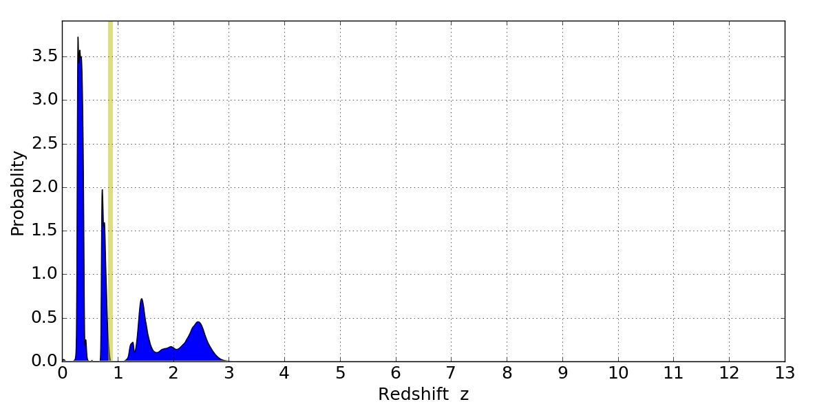In P(z) plots: Yellow lines mark the cluster redshift z = 0.870,