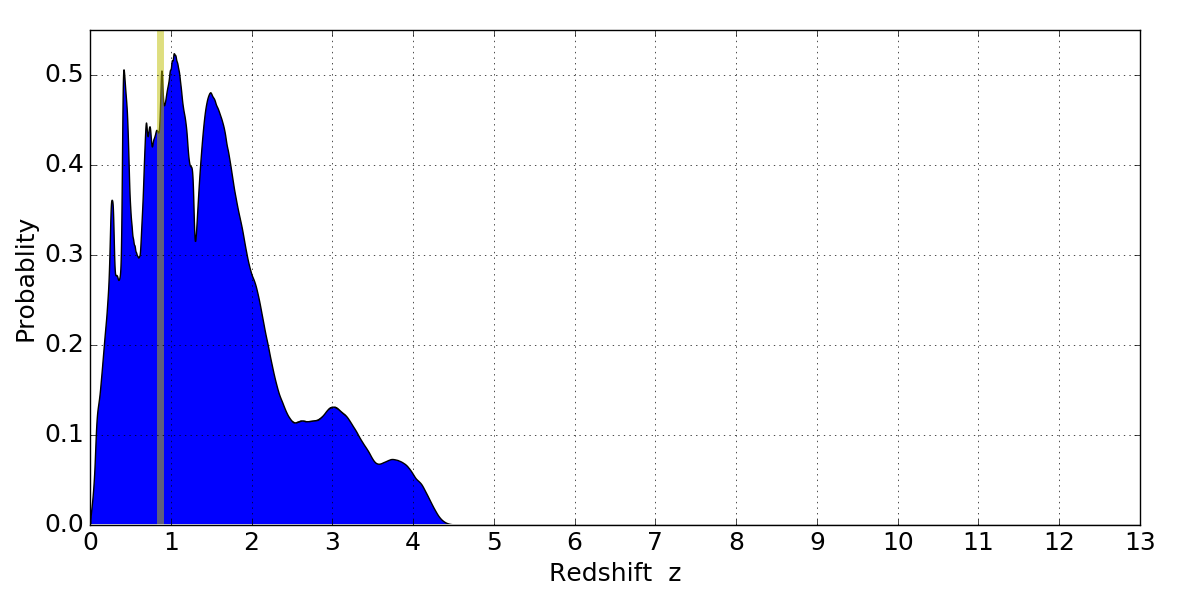 In P(z) plots: Yellow lines mark the cluster redshift z = 0.870,