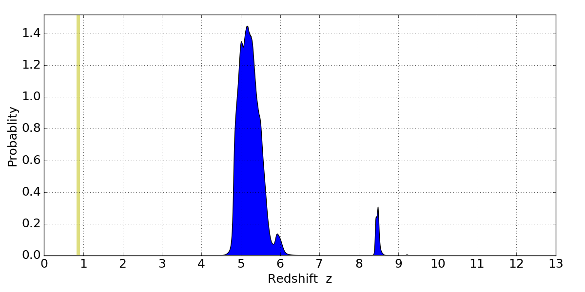 In P(z) plots: Yellow lines mark the cluster redshift z = 0.870,