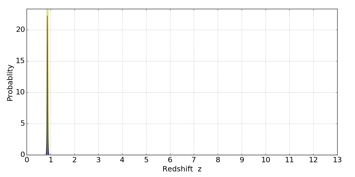 In P(z) plots: Yellow lines mark the cluster redshift z = 0.870,