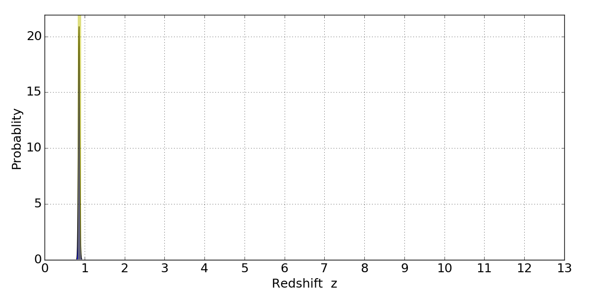 In P(z) plots: Yellow lines mark the cluster redshift z = 0.870,