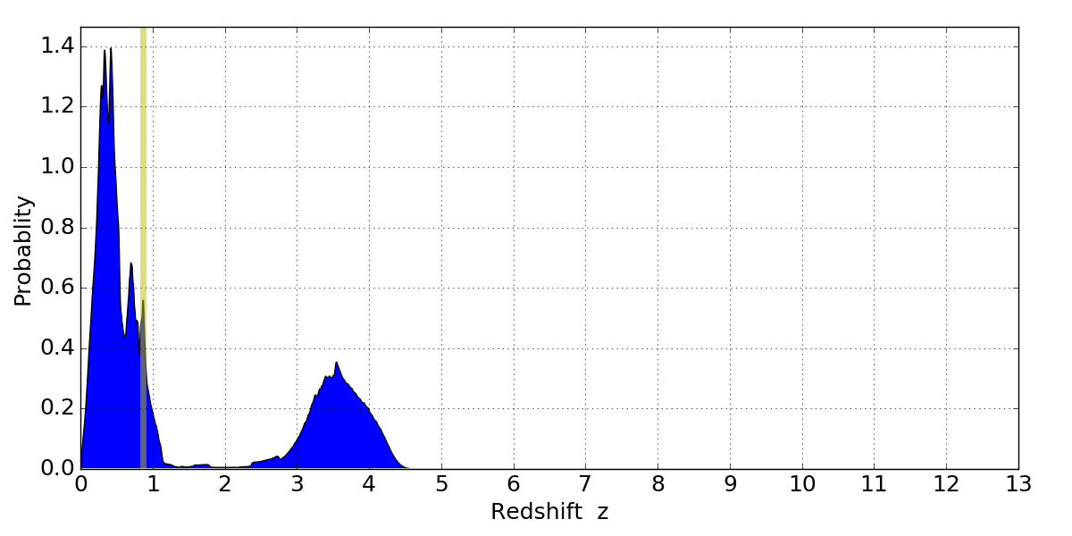 In P(z) plots: Yellow lines mark the cluster redshift z = 0.870,