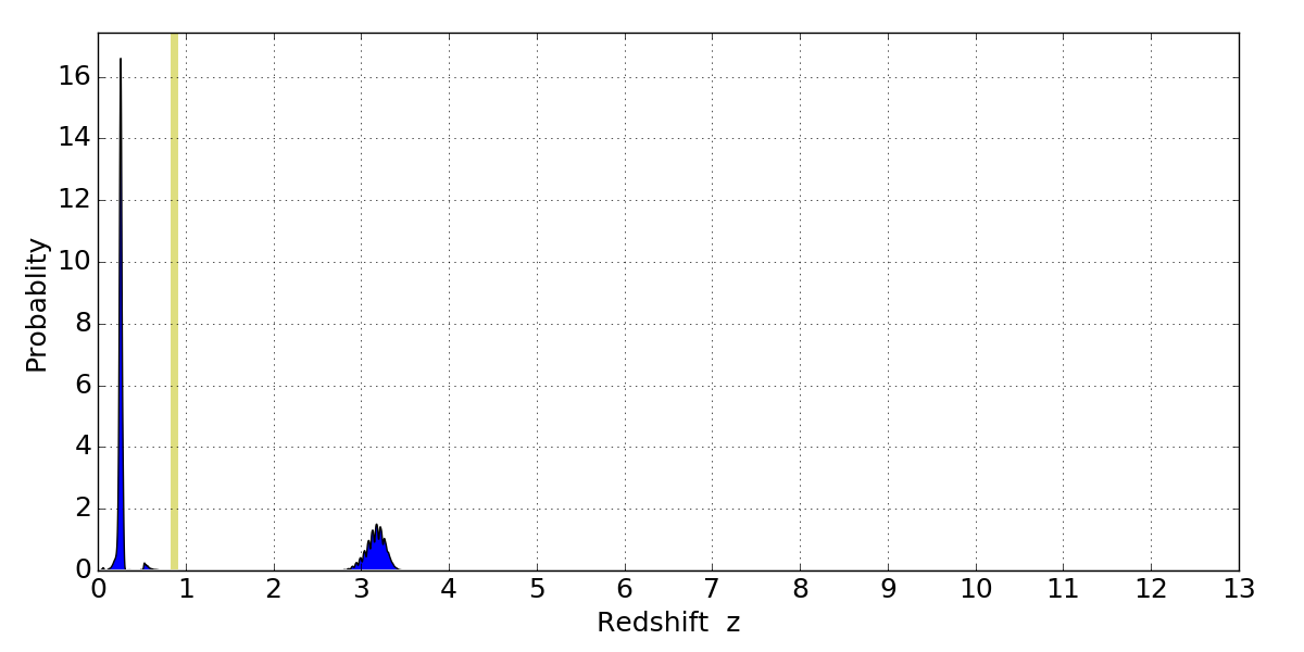 In P(z) plots: Yellow lines mark the cluster redshift z = 0.870,