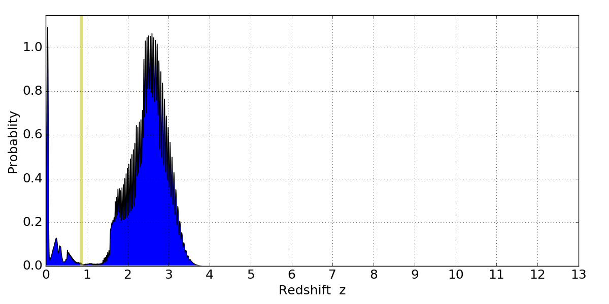 In P(z) plots: Yellow lines mark the cluster redshift z = 0.870,