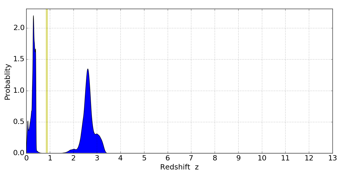 In P(z) plots: Yellow lines mark the cluster redshift z = 0.870,