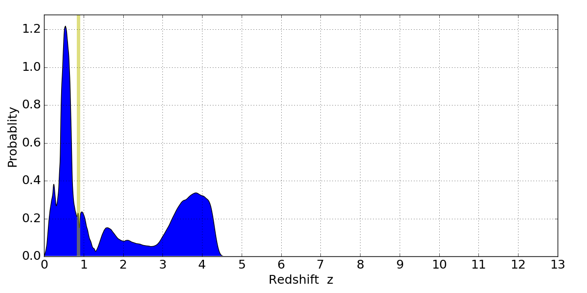 In P(z) plots: Yellow lines mark the cluster redshift z = 0.870,