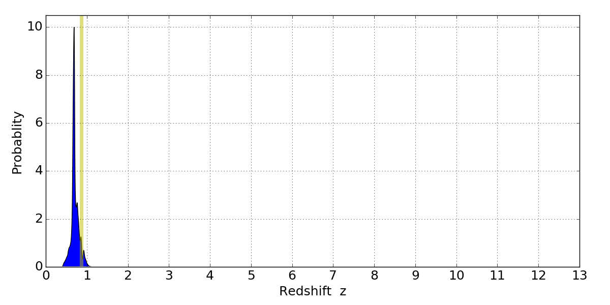 In P(z) plots: Yellow lines mark the cluster redshift z = 0.870,