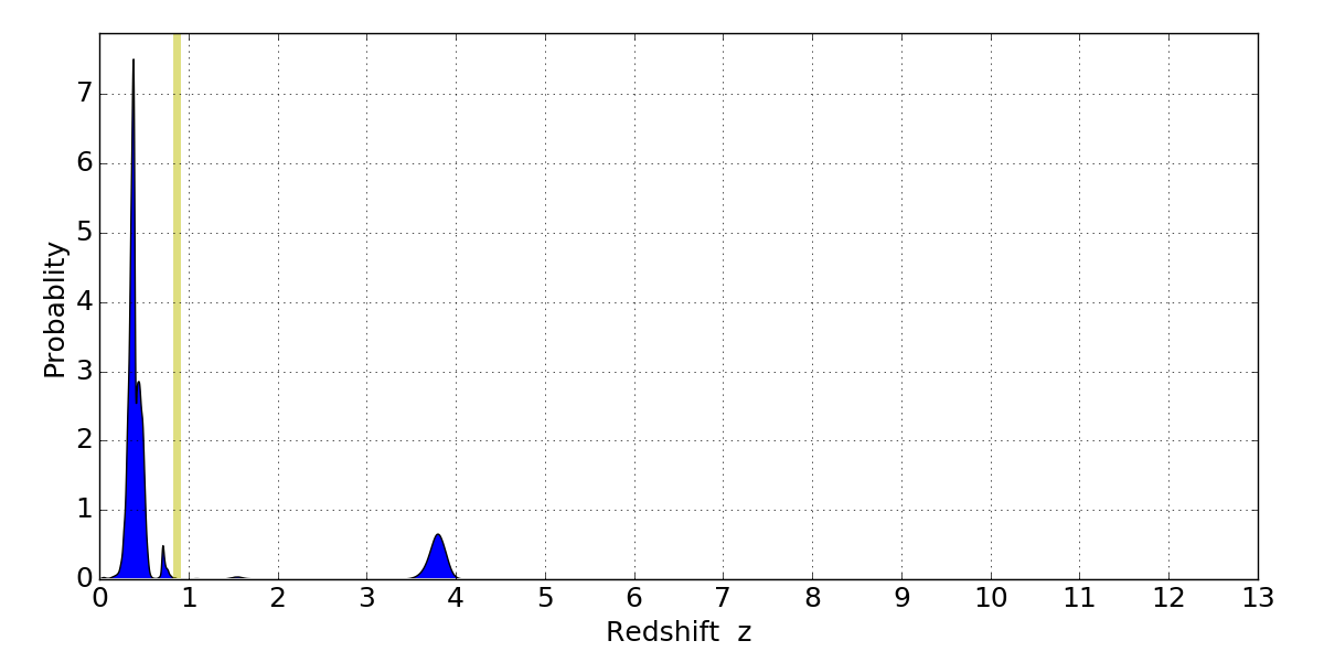 In P(z) plots: Yellow lines mark the cluster redshift z = 0.870,