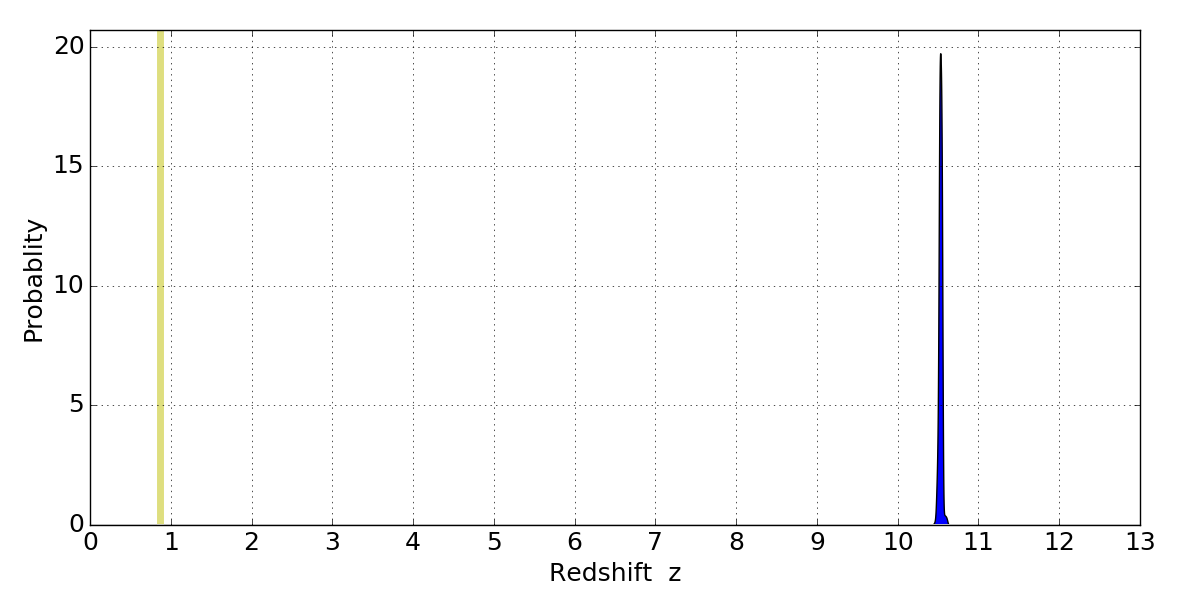 In P(z) plots: Yellow lines mark the cluster redshift z = 0.870,