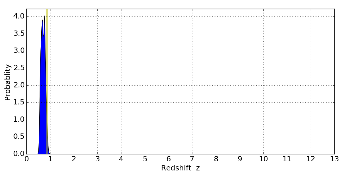 In P(z) plots: Yellow lines mark the cluster redshift z = 0.870,